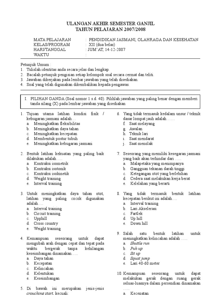 Contoh soal uas penjas kelas xi semester 2 pg dan essay beserta jawaban. Soal kebugaran jasmani beserta jawaban bagi para siswa ataupun guru yang sedang membutuhkan soal penjas materi kebugaran jasmani. Soal uas/pas penjaskes kelas 6 ini juga kami berikan kunci jawaban sehingga kalian dapat dengan mudah untuk menghafalnya. Unduh buku pendidikan jasmani olahraga dan kesehatan kelas 5 kurikulum 2013 pdf secara gratis di sampdf. Klik saja untuk mendownload soal penjas smp sma k13 lainnya. Download soal kebugaran jasmani kurikulum 13 tombol yang haris diklik terletak di. Berdasarkan tabel di atas, berbagai cara. Home » bank soal penjas » soal penjas materi kebugaran jasmani lengkap jawabannya. Der opera browser mit kostenlosem vpn, ad blocker und energiesparmodus! Download kumpulan latihan soal uas kelas 5 sd. Hari ini saya berbagi soal pjok kelas 4 semester 2 bab kebugaran jasmani yang biasanya hanya tematik tapi saya berbagi pjok. Preview soal ukk pat pjok kelas 11 semester 2 kurikulum 2013. Soal kebugaran jasmani beserta jawaban.